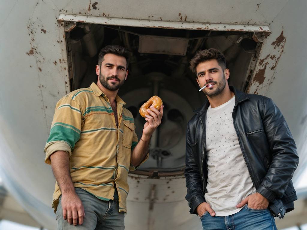 The boys are working so hard on the airplane while smoking and eating donuts.